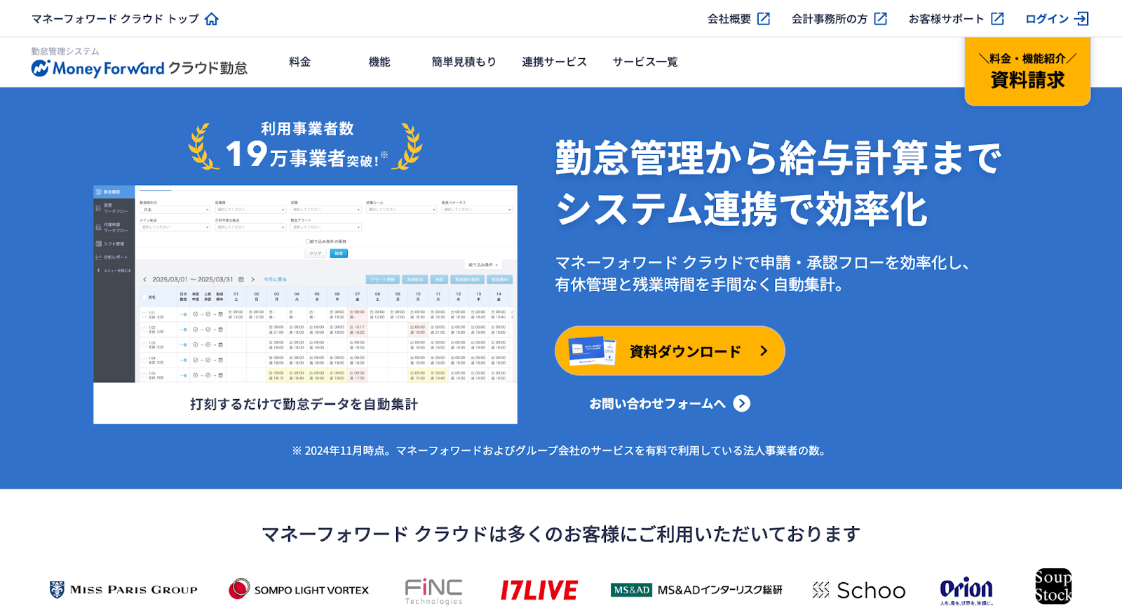マネーフォワード クラウド勤怠は勤怠管理を中心にバックオフィス業務を効率化できるクラウドサービスで、Web・スマートフォン・GPS打刻に対応しています。