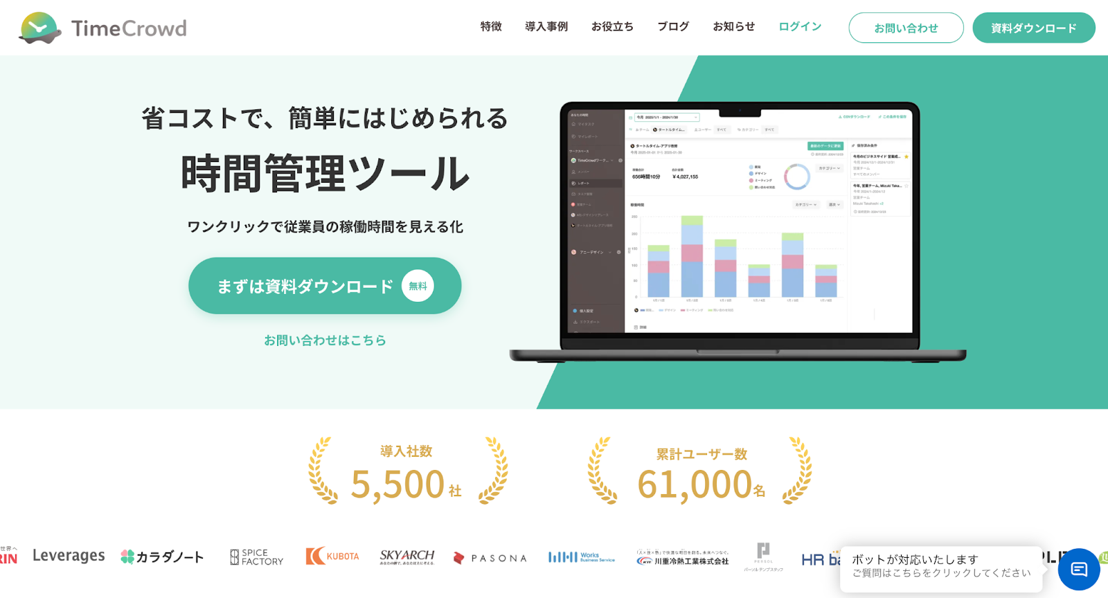 TimeCrowdはチームの稼働状況をリアルタイムで確認できる国産の時間管理ツールで、ワンクリックで打刻しタスクごとの作業時間を自動集計します。