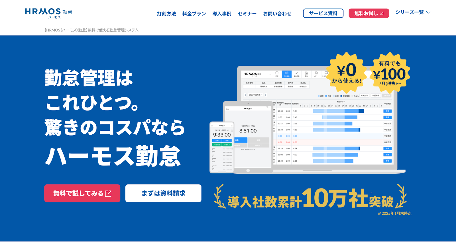 HRMOS勤怠は無料から使えるクラウド勤怠管理システムで、PCやスマートフォン、ICカードなどの打刻手段に対応し勤怠データを自動で集計できます。