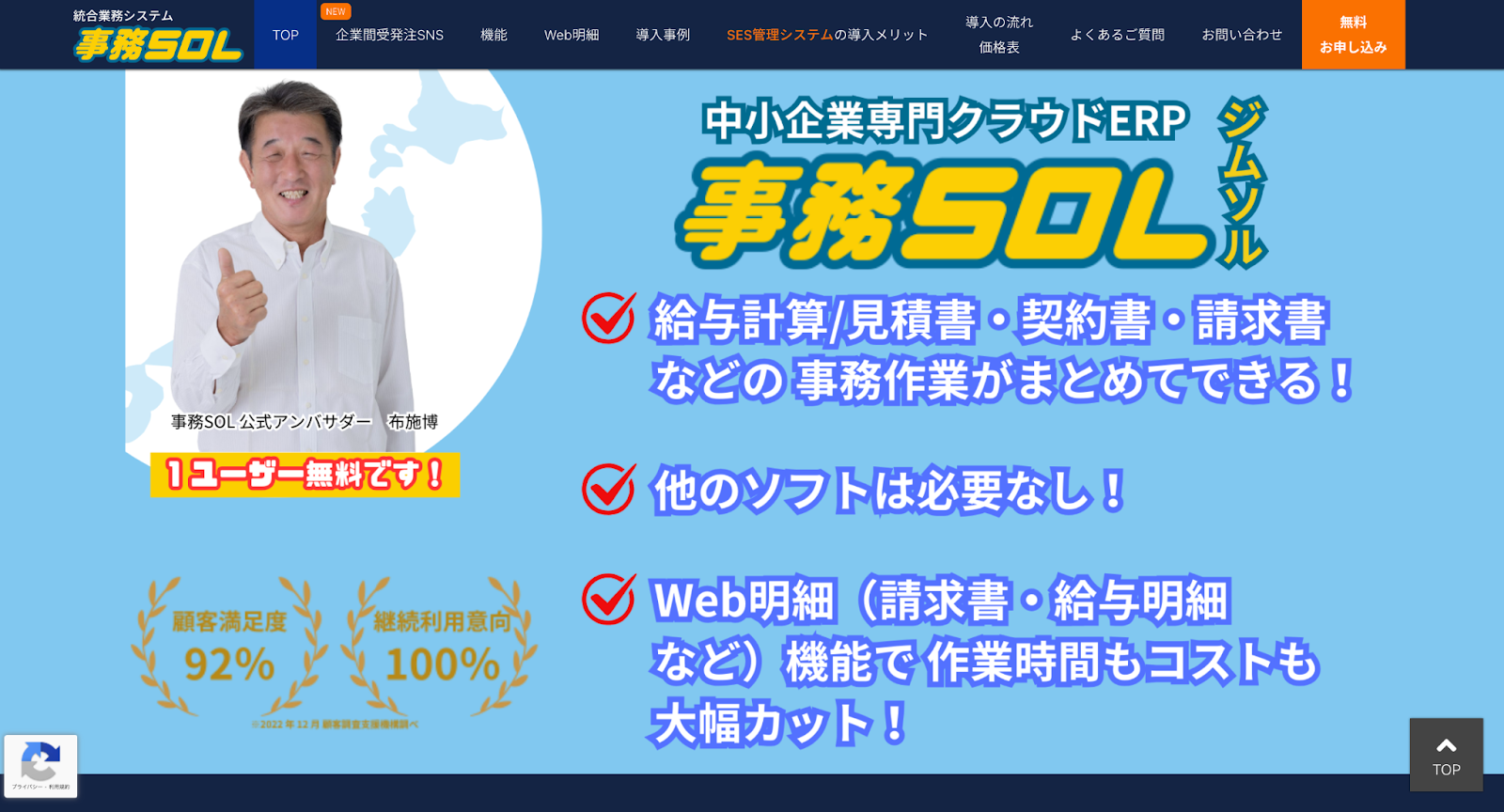 事務SOLは中小SES企業向けのクラウドERPシステムで、案件管理から請求書作成、給与計算、経営分析までSES顧客リスト管理に必要な機能を統合しています。